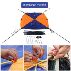 | 1: Verbinden Sie die Stangen und führen Sei diese durch die Fixierungsbänder an der Plane.2: Die kurzen Stangen sind auf beiden Seiten der Hülse befestigt, und die langen Stangen werden von beiden Seiten gleichmäßig übereinander angeordnet und mittig durch Verknotung befestigt.3: Die Stangen kreuzen sich horizontal und vertikal.4: Entfernen Sie die vier D-förmigen Schnallen im Inneren des Täschchens, befestigen Sie sie vor und hinter den vier Gewindelöchern des Bootes und ziehen Sie die Schraubenschnalle oben an.5: Sonnenschutz/Dach aufrichten und die vier Enden der Stange in den Ringstift der D-förmigen Schnalle stecken und dann das Seil über die Ecke des Daches einhängen, um das Zelt zu befestigen.6: Wenn das Zelt komplett befestigt ist kann es beim Bootfahren benutzt werden |