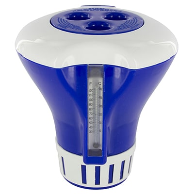 Schwimmender Dosierbehälter zur Verwendung von handelsüblicher Poolchemie in Tablettenform mit integriertem Thermometer.
