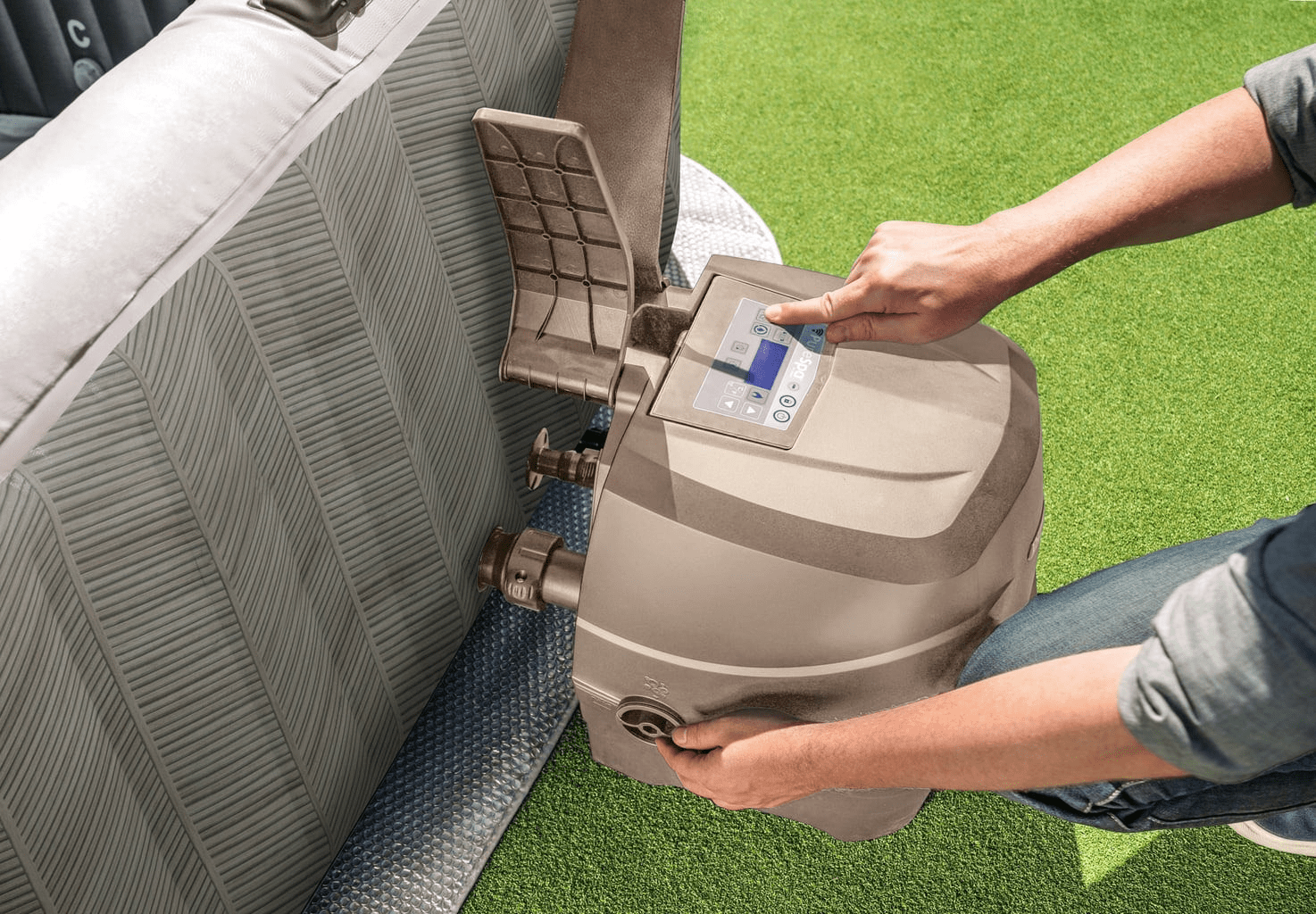 Im Set enthalten sind Abdeckung, Bodenschutzplane, Filterkartuschen und eine Tragetasche – perfekt für entspannte Momente zu Hause.