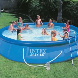 Die runden Easy-Set Pools von Intex sind leicht zu montieren. Das Zubehör bietet dem Käufer dieses Pool-Sets eine komfortable Handhabung, Instandhaltung und viel Spass. Maße: ca. 457 x 91 cm. Wasserkapazität: bei 80% Befüllung 10.680 Liter. Einfacher Aufbau. Nachdem der Beckenring aufgepumpt ist einfach auffüllen – der Pool richtet sich von allein auf. Betriebsbereit in 15 Minuten. Der Pool ist geeignet für Kinder ab 6 Jahren.