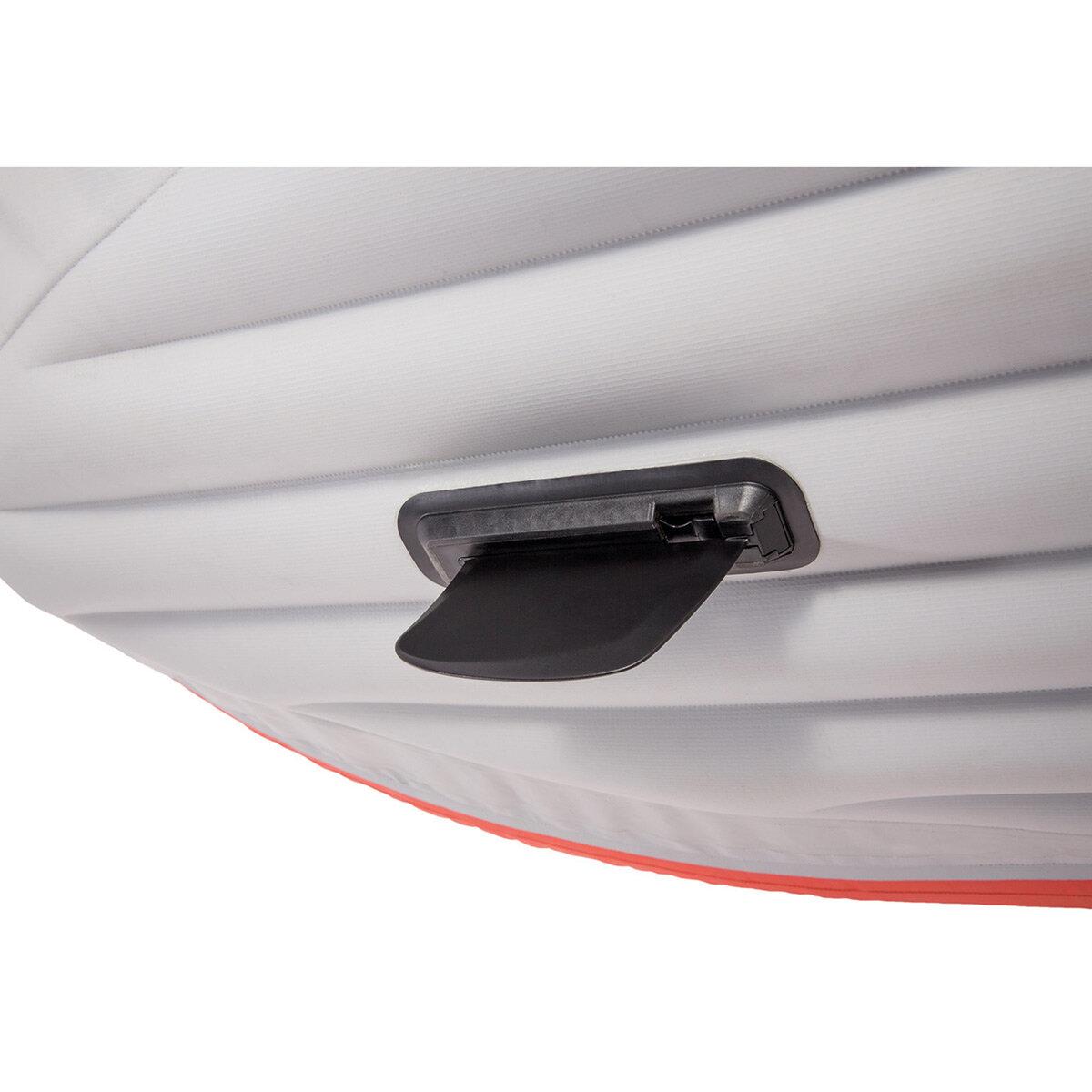 Excursion Pro Kajak bietet für 2 Personen bzw. max. 180 kg, bei einer Größe von 384 x 94 x 46 cm (L x B x H) viel Platz. Das Komplettset verfügt nicht nur über 2 Paddel und eine hochleistungs Luftpumpe sondern auch über eine Unzahl von kostenlosem Zubehör wie z.B. zwei verstellbare Schalensitze mit Rückenlehne, aufblasbare Unterlage für erhöhte Sitzplätze, zwei im Kajakboden montierte Fußstützen, zwei integrierte Angelrutenhalter, Haltegriffe an beiden Enden und abnehmbare und verstellbare Halterung für weiteres Zubehör wie zum Beispiel: GPS-Systeme, Fisch Sucher, schwenkbare Angelrutenhalter usw. Der zusätzliche Stauraum der sich im Bug und im Heck des Kajaks befindet, wird mit Edelstahlringen befestigt. Das Excursion Pro Kajak besteht aus einem SUPER-TOUGH™ Laminatmaterial mit Polyester Kern für extra Schlag- und Abriebfestigkeit. Das Kajak verfügt über zwei speziell entwickelte, abnehmbare Skegs für optimale Nutzung, dadurch ist es durch tiefe und flache Gewässer perfekt manövrierbar. Die hohe Druckbeaufschlagung sorgt für zusätzliche Steifigkeit und Stabilität, mit hochdruckgefederten Ventilen für