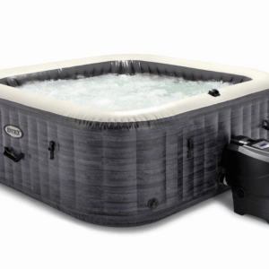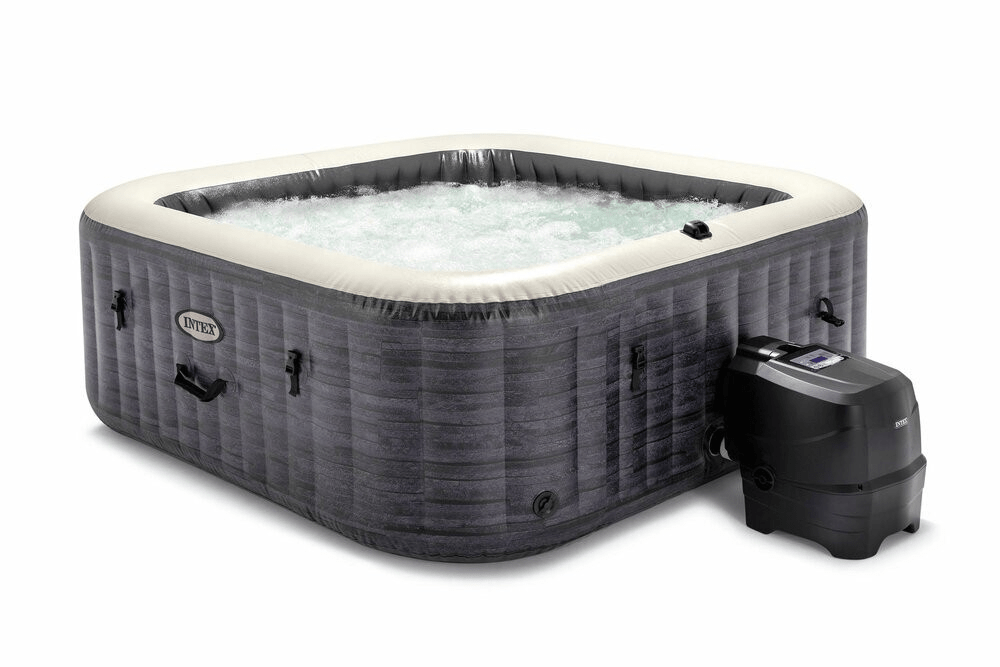 Die schlanke, quadratische Form mit dem Greystone-Muster ist eine schöne Ergänzung für Ihre Terrasse oder Ihren Garten und bietet gleichzeitig einen rundum luxuriösen Komfort. Das voll integrierte QuickFill Inflation System macht das Aufstellen zum Kinderspiel, während das Salzwassersystem und das integrierte Kalkschutzsystem für eine mühelose Wasserpflege sorgt. Lassen Sie sich von 170 leistungsstarken Sprudeldüsen verwöhnen, ruhen Sie sich mit den mitgelieferten Premium-Kopfstützen bequem aus und sorgen Sie mit den mehrfarbig wechselnden LED-Lichtern für eine stimmungsvolle Atmosphäre bei nächtlichen Bädern. Die Kompatibilität mit der Intex Link Spa Management App ermöglicht eine einfache Programmierung Ihres Whirlpools von überall aus.